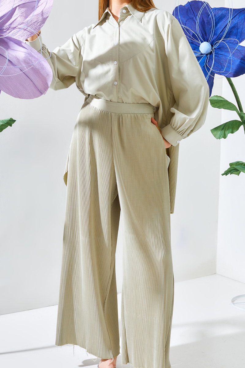 This stunning pants is designed in a unfinished pleated cotton that gives texture.