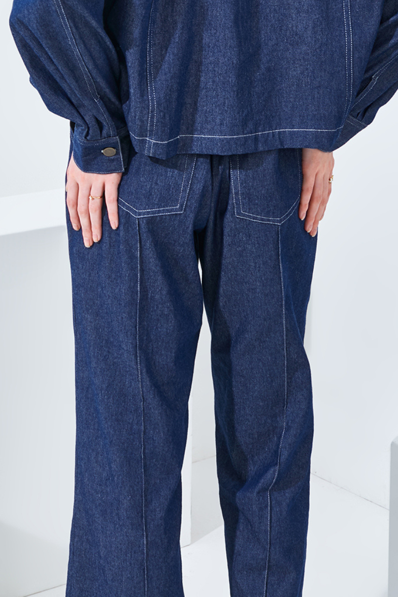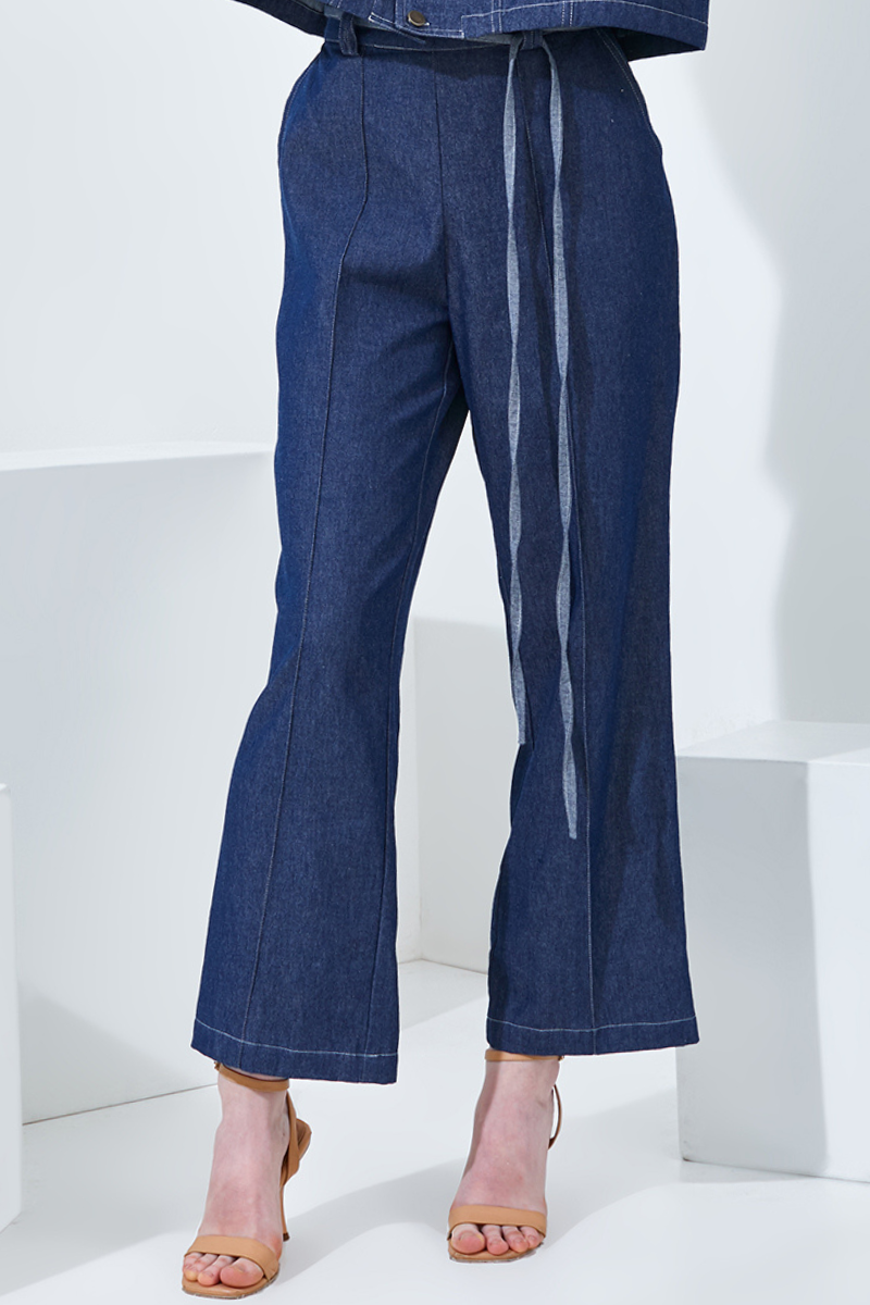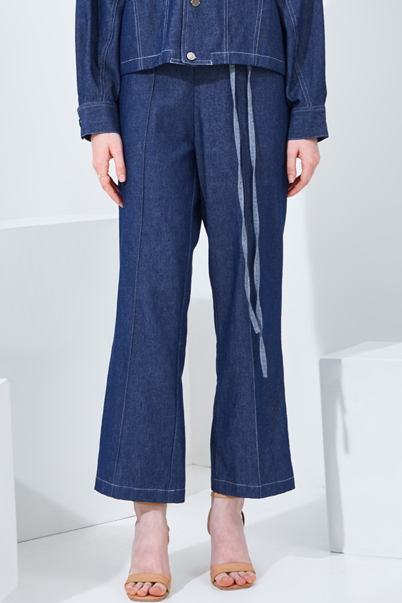 Introducing our new high-waisted straight pants: Kiara. Designed with a relaxed fit, made from denim cotton fabric, a tie-up fabric belt, and handy pockets, Perfect for semi-formal occasions.