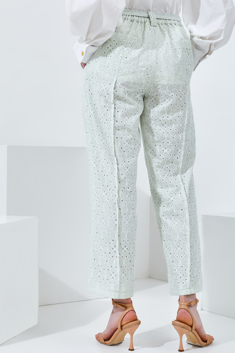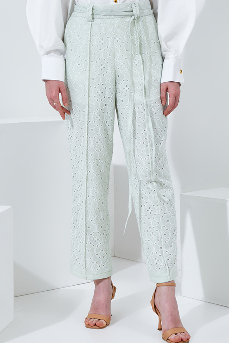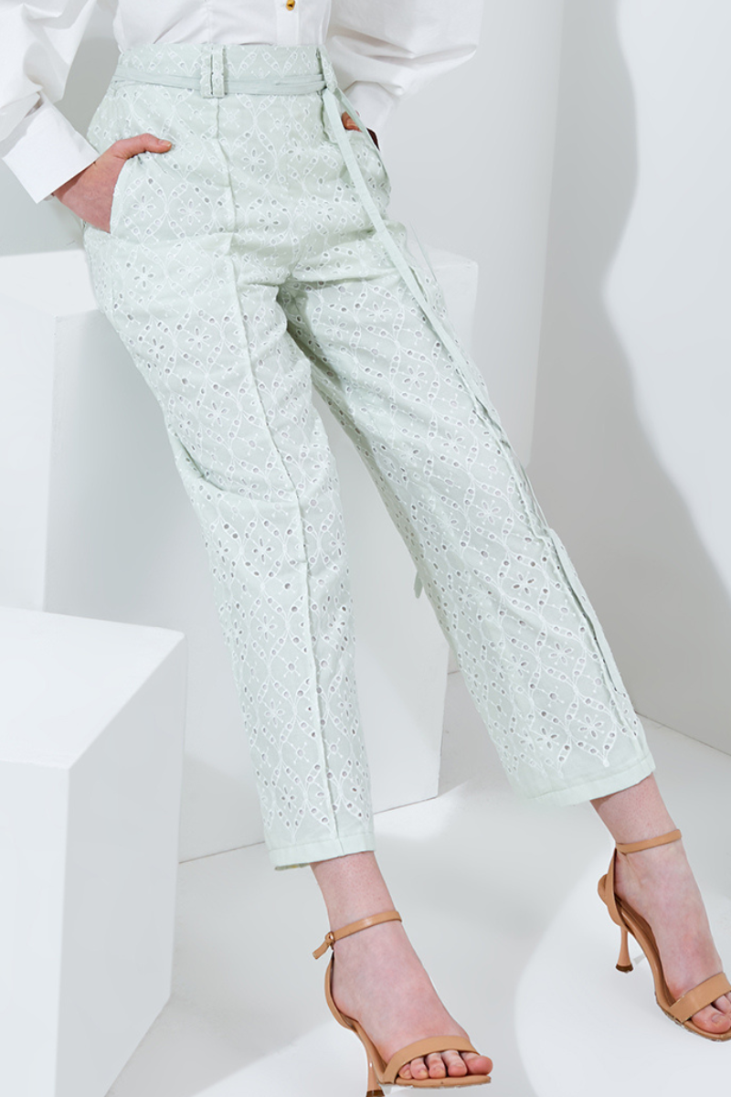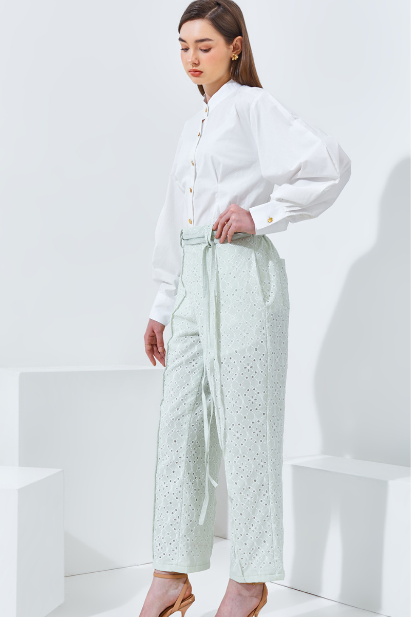 Introducing our new high-waisted straight pants: Kiara. Designed with a relaxed fit, made from embroidered fabric, a tie-up fabric belt, and handy pockets, Perfect for semi-formal occasions.
