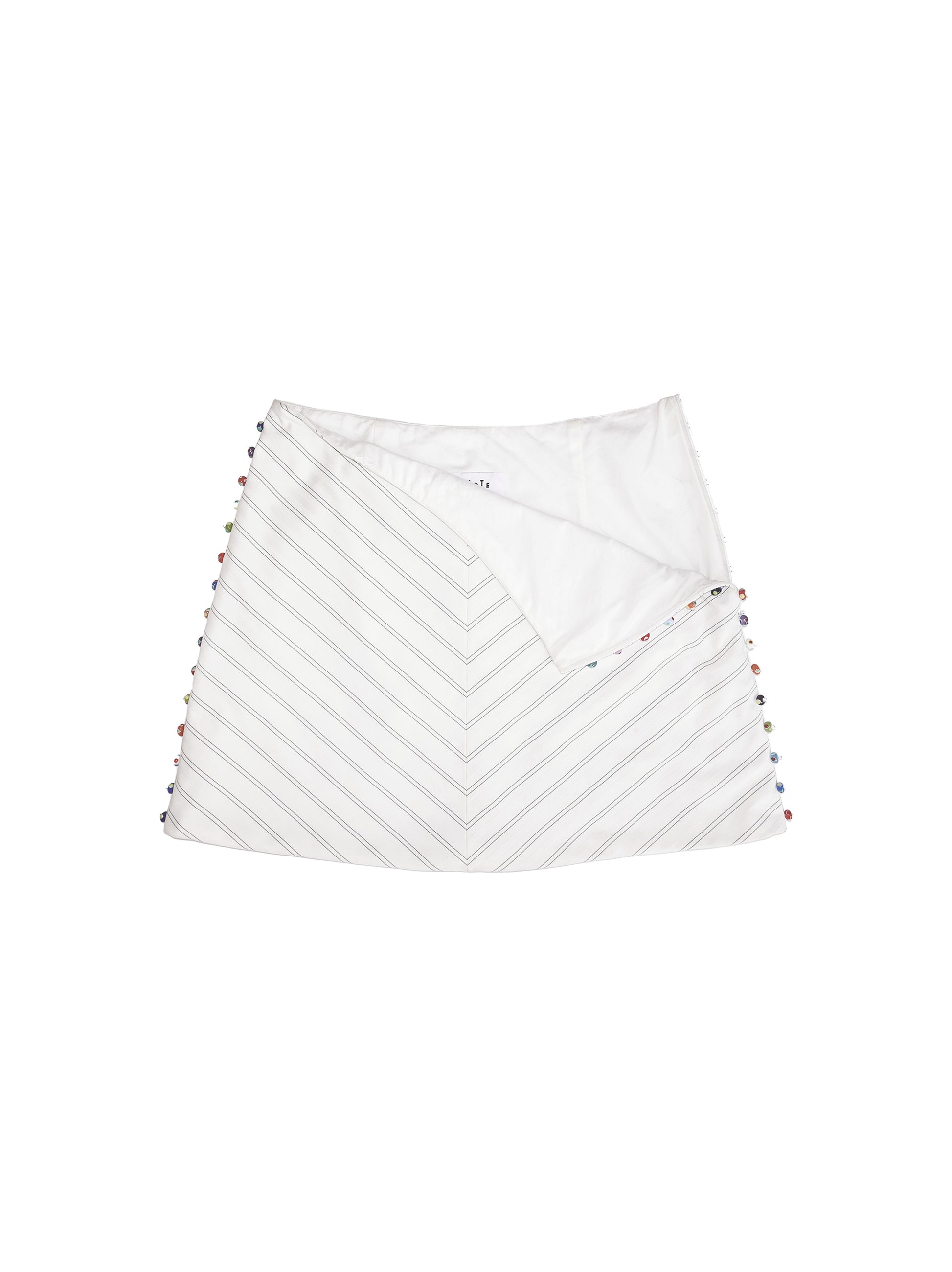 Your perfect skirt for summer, made in biased cut stripes cotton fabric featuring multicolored ceramic beading details on the sides, finished with side-zip opening, straight hem and interlining.