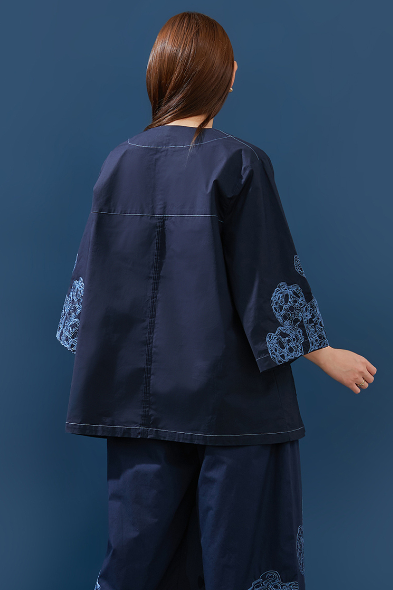 Naraya Outerwear - a sea-inspired memento. The navy color is paired with our in-house designed Coral Embroidery pattern.