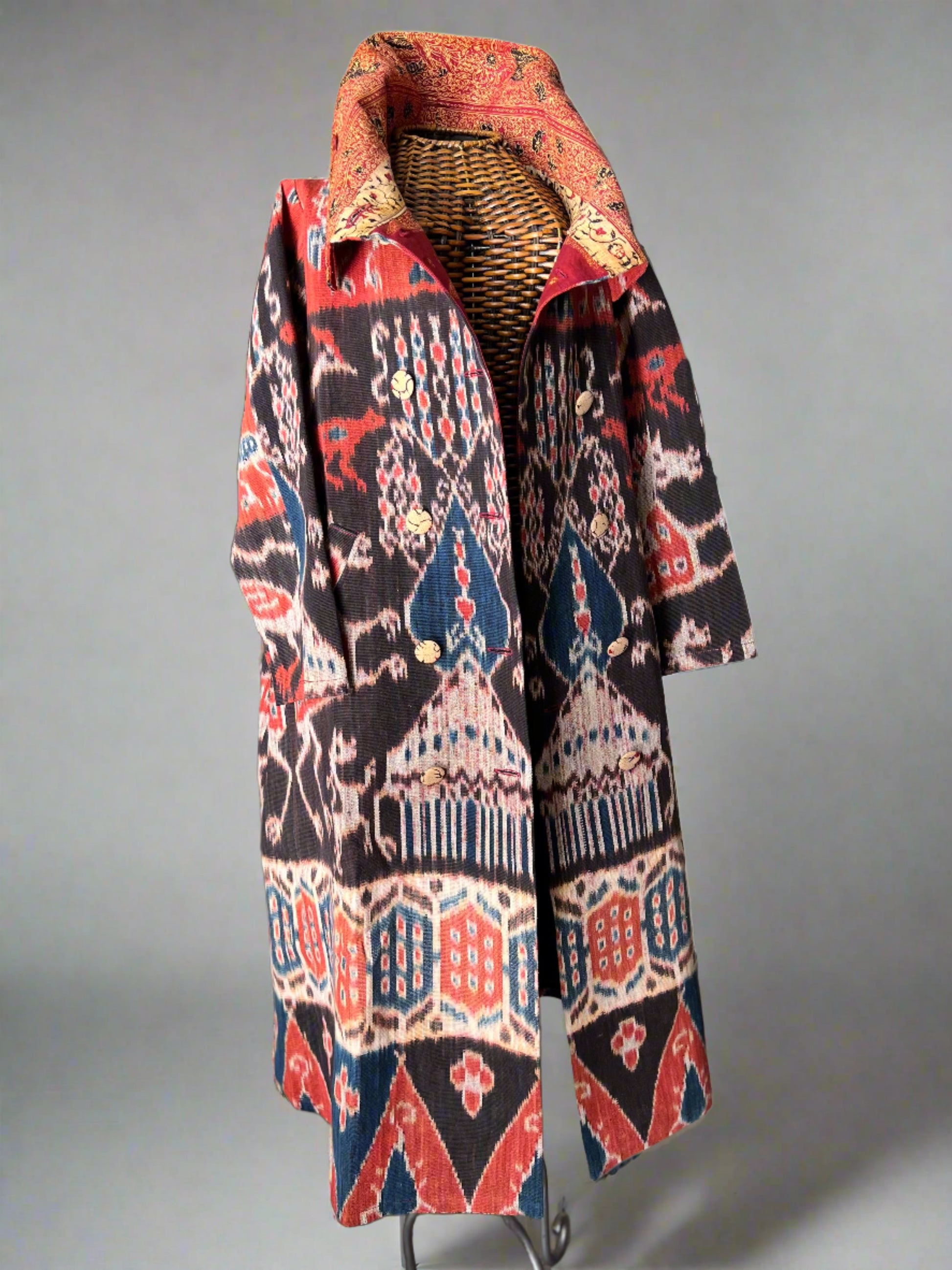 Handwoven textile by artisan weavers in the island of Sumba, Indonesia. One of a kind! Lined with hand-drawn Batik, this double-breasted coat is a wearable artwork! Uniquely chic and comfortable with bonus matching face mask!