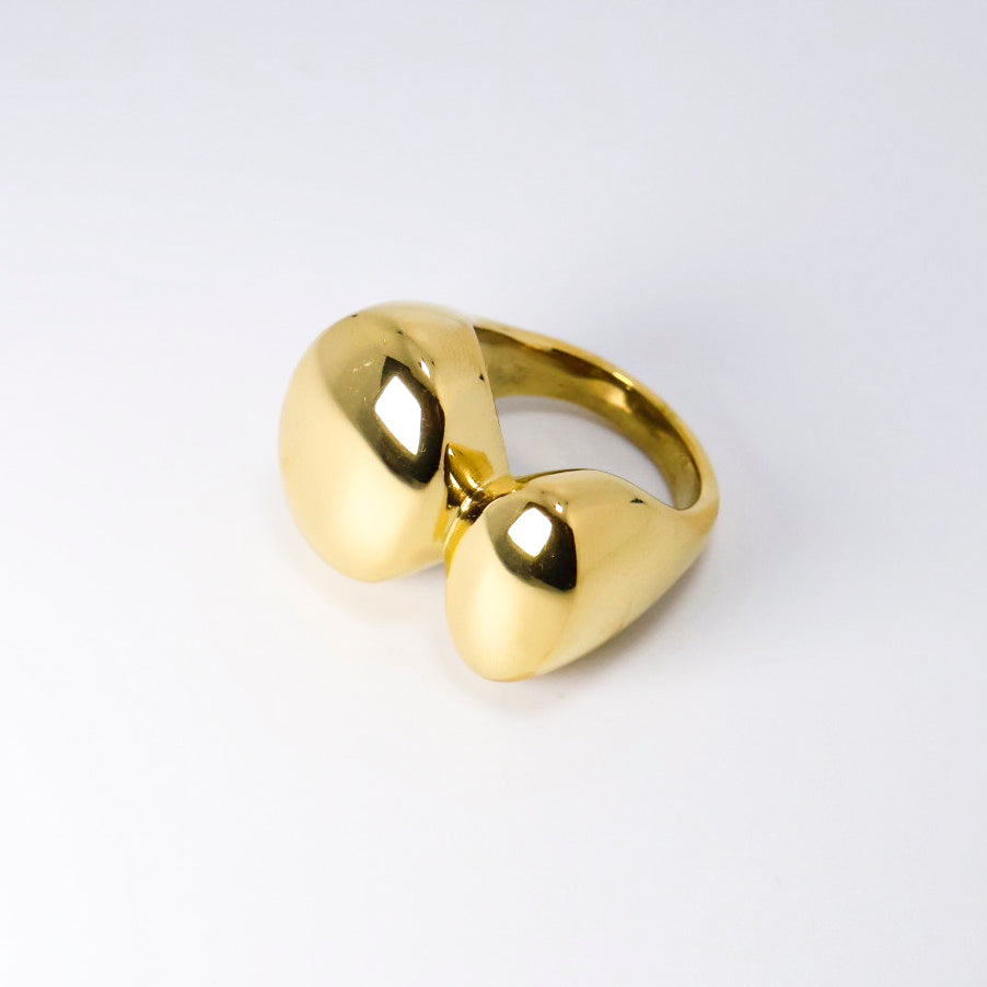 The "PERSPECTIVE" ring is a bold statement in 18k gold-plated stainless steel, designed to shift as beautifully as the viewpoint of its beholder. Inspired by the dual nature of reflection and shadow. The twin dome design plays with light and depth, offering a different silhouette from every angle. It’s a ring that challenges the onlooker to see beyond the surface and discover new aspects.
