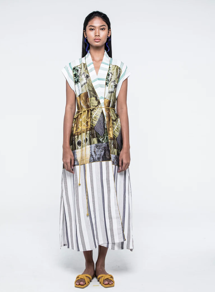 A collaboration between designer and photographer creates unique patterns from combining photography and fabric exploration. Dress is made of soft and breathable fabric from natural fiber, A versatile wrap dress with cap-sleeves, Cinch the waist with the belt . Made in Jakarta, Indonesia