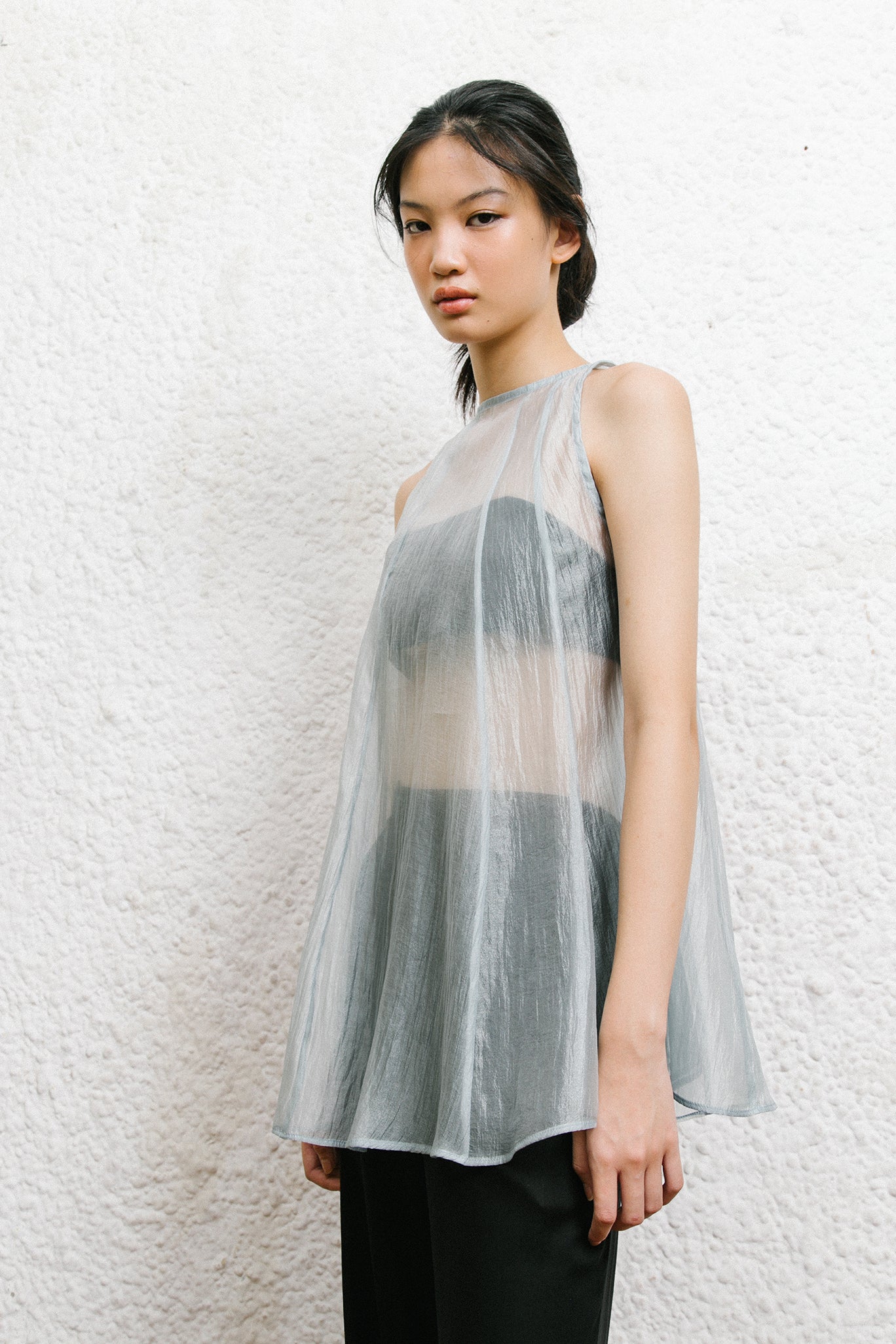 A semi-halter cut top with pattern cutting details, Gemma comes in black, olive, pearl, and ash blue colors of sheer fabric material. Gemma is a reversible top with buttons on its other side. This sheer A-line top is a perfect match for Debby and Sherry pants.
