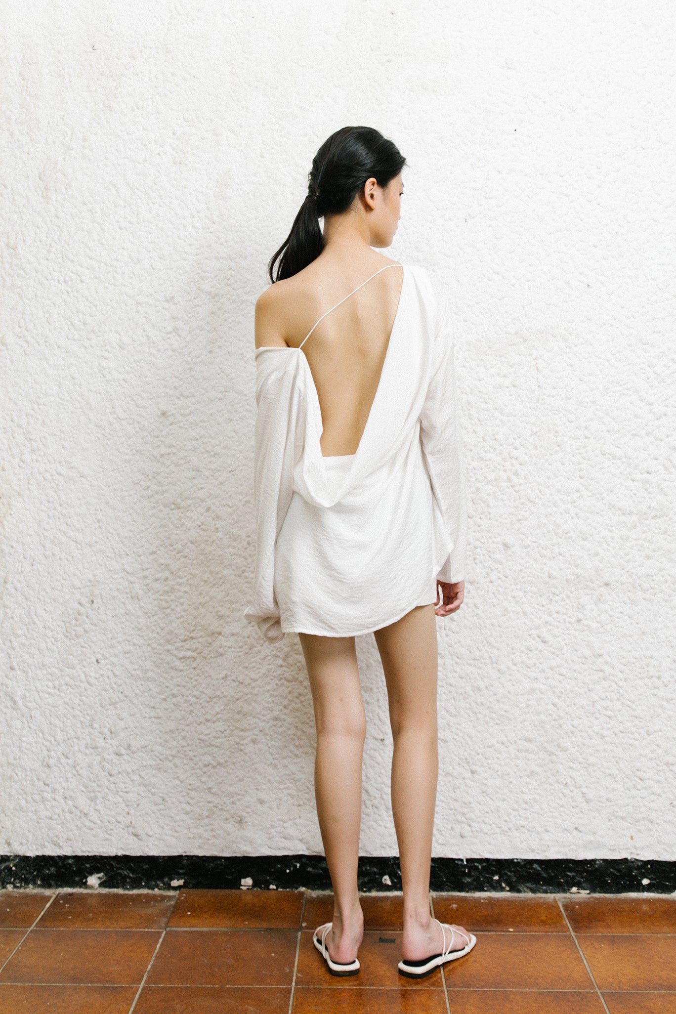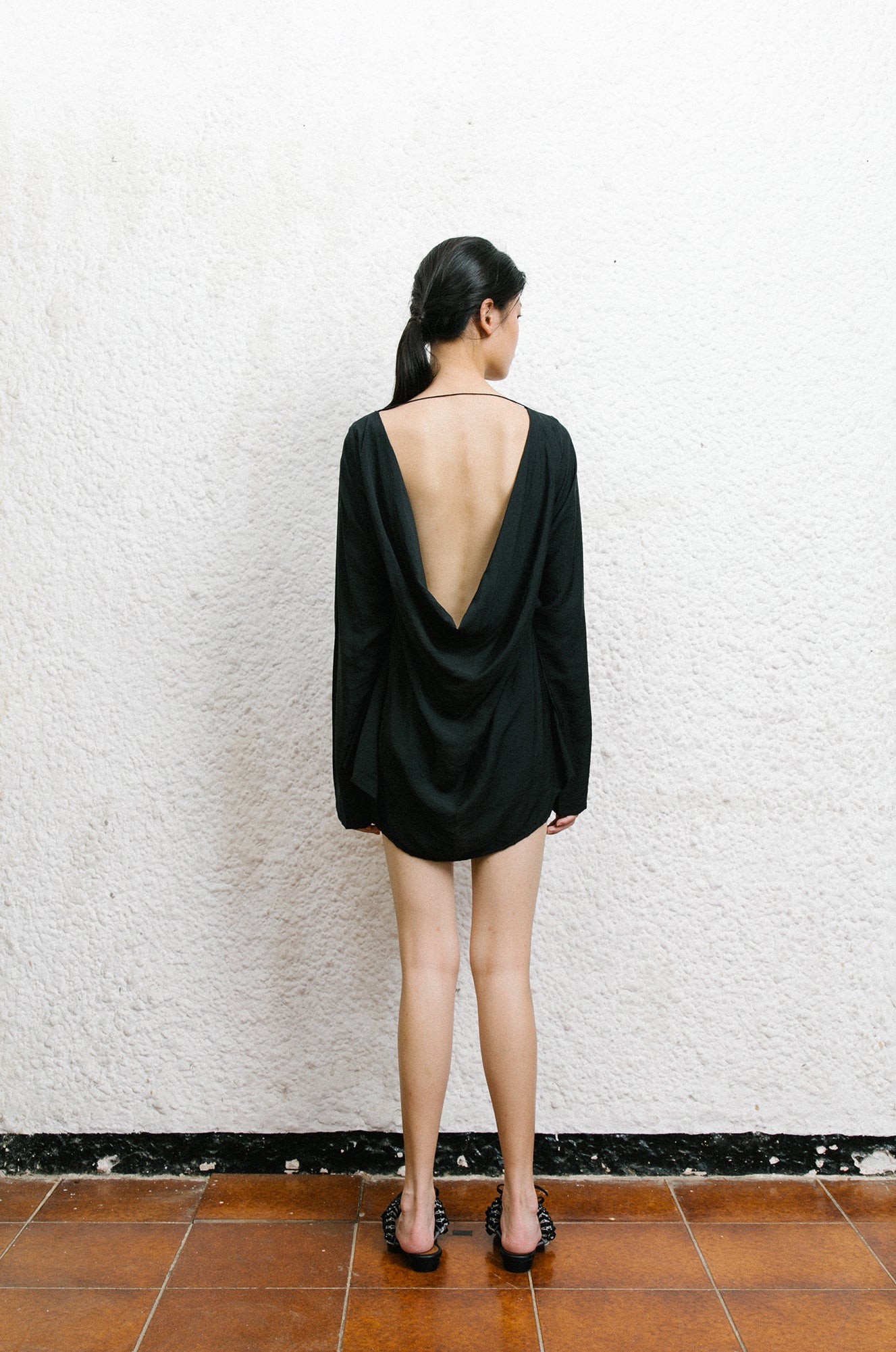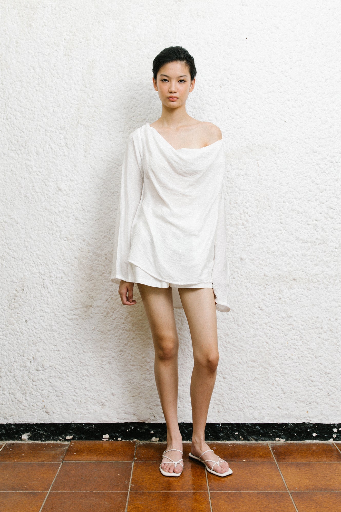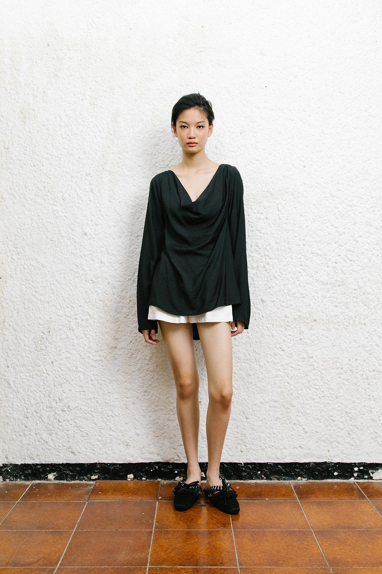 An effortless yet sophisticated long-sleeved top. Heidi has draping details on its front and back. Its drapery details on the back are lower making a backless silhouette. Heidi is made of an airy fabric that is comfortable even with its long sleeves. It comes in two colors black and white that match perfectly with Alika pants or Maya skirt.