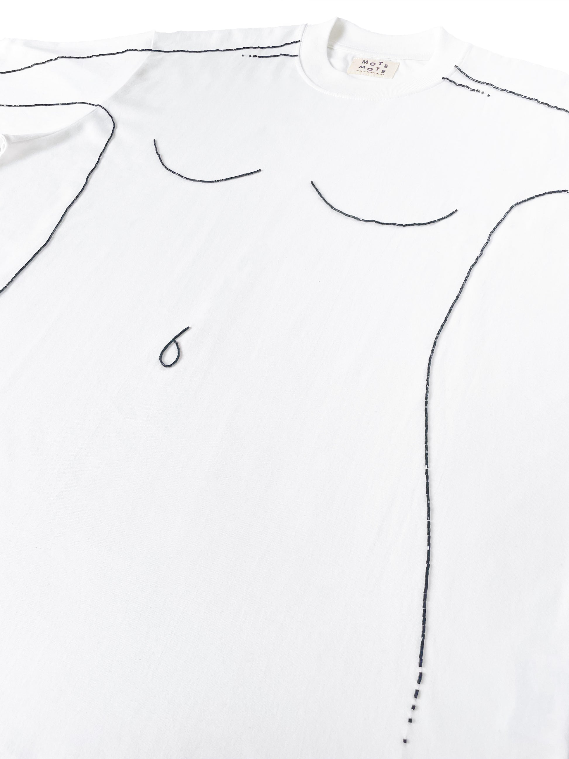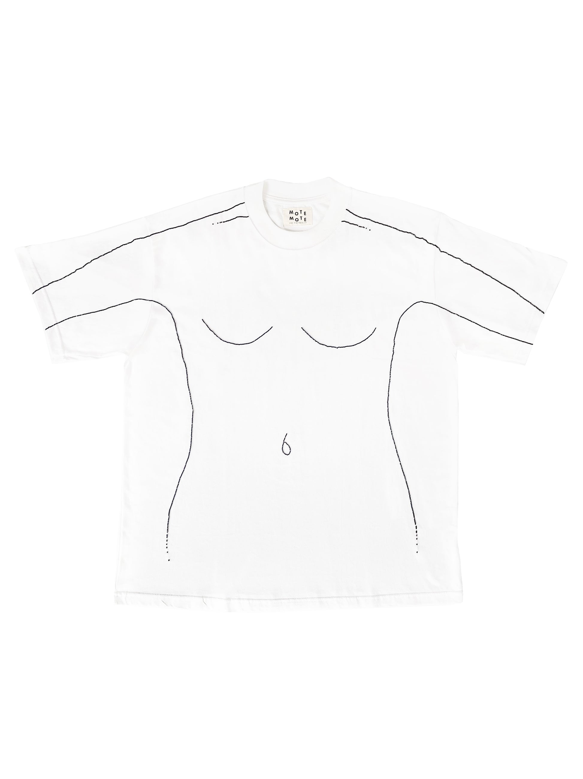 Oversized cut crew neck Tee in soft cotton made in unisex fitting. Adorned with monochromatic hand-beaded body silhouette detailing.