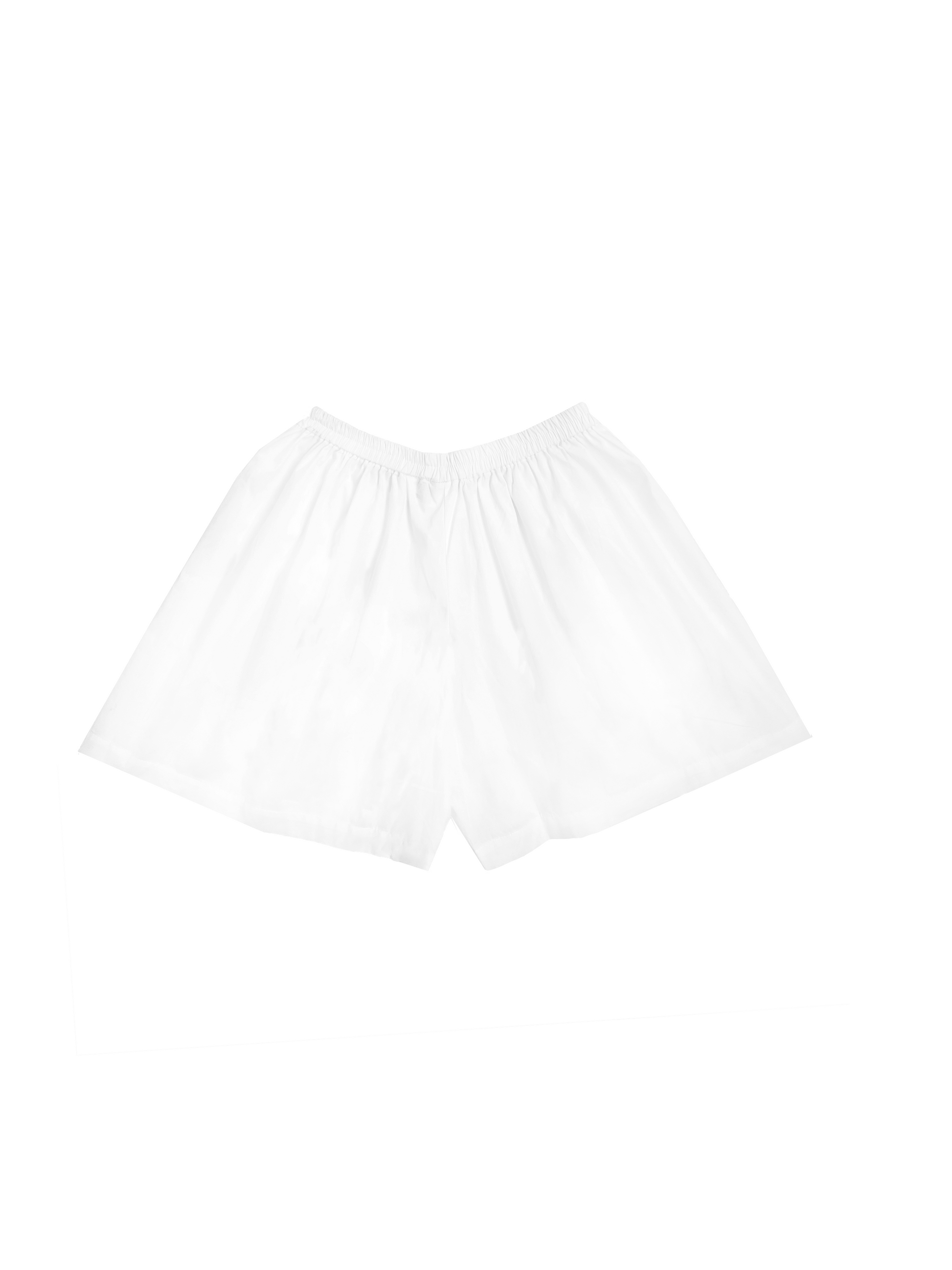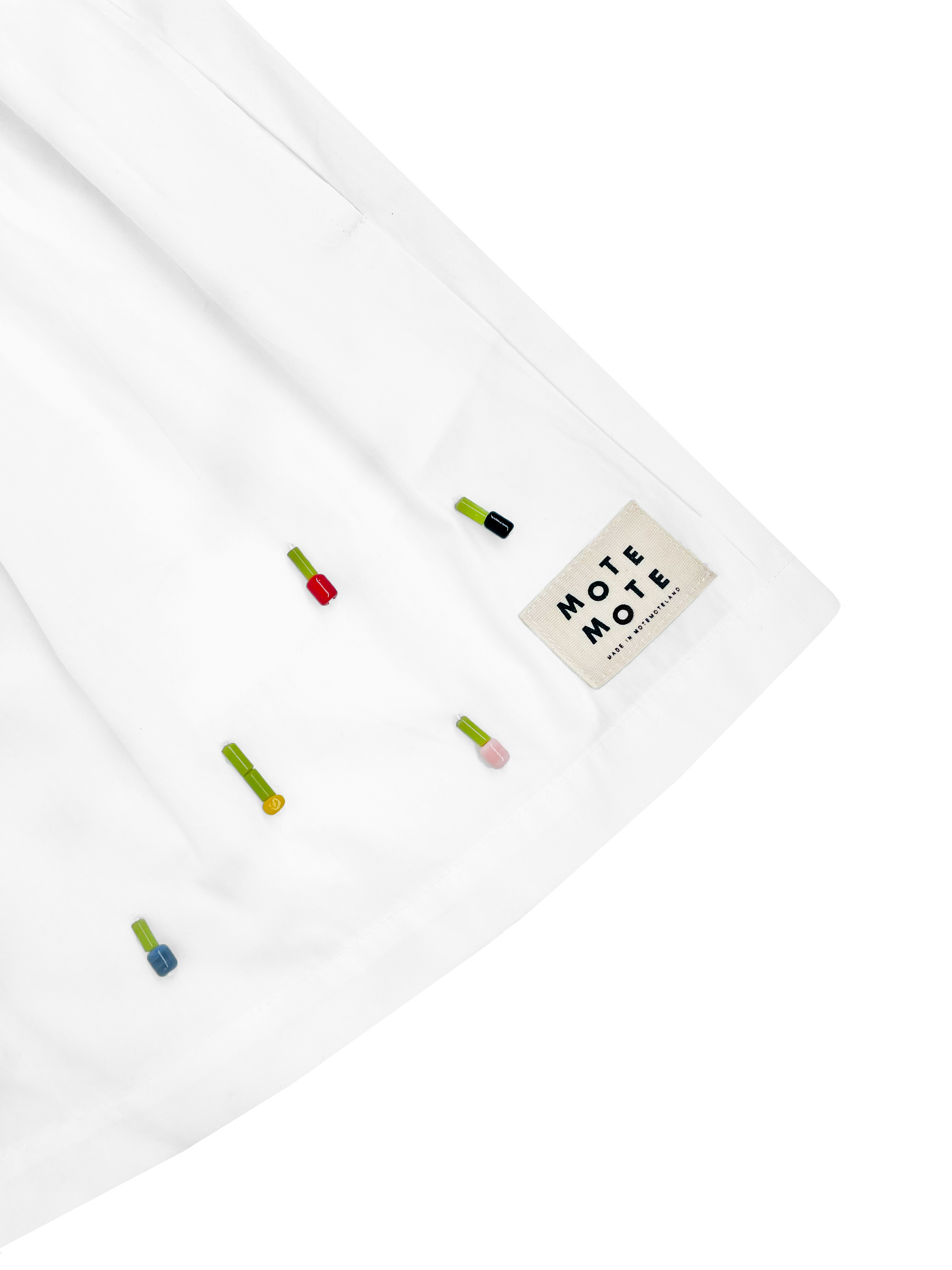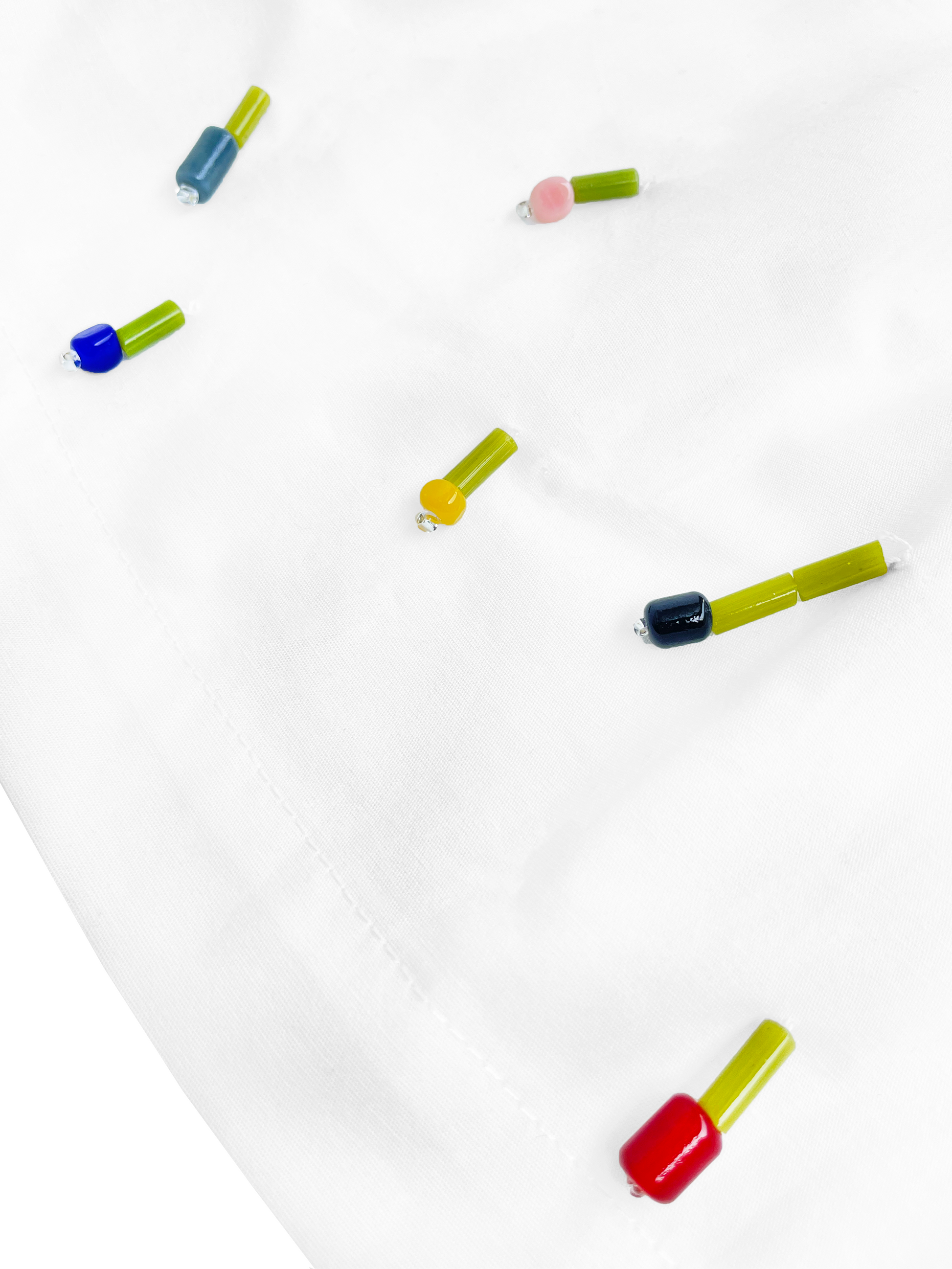 Unisex-cut relaxed shorts with double front pockets, elastic waistband and adorned with vibrant ceramic beadings. Available in size S-M & M-L.